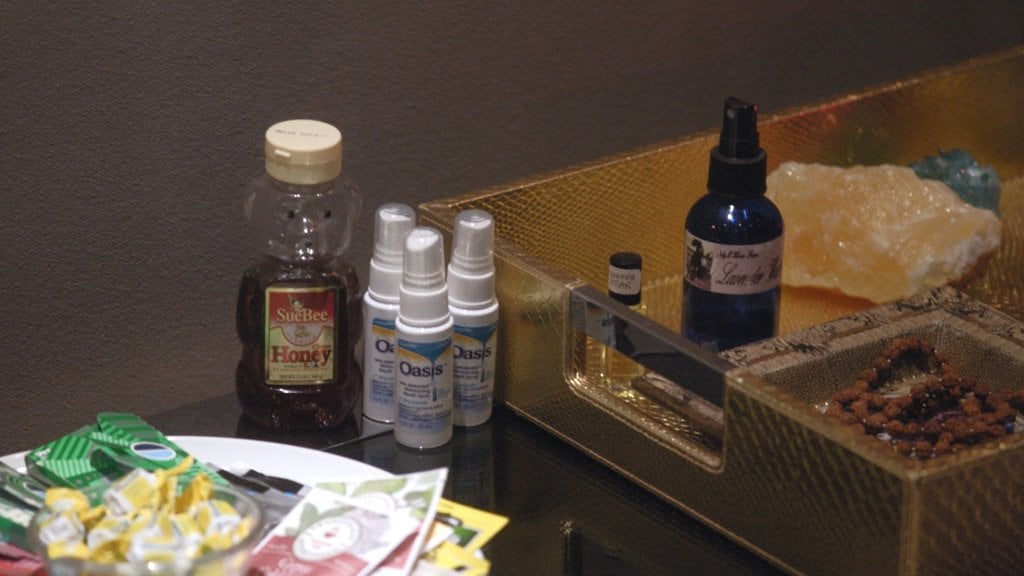 Spray a throat spray in the back of your throat. With this spray it is certified and found to have no toxic material that can cause harm to the user. When I perform I bring a mixture of Throat Coat honey lemon in a big water bottle.